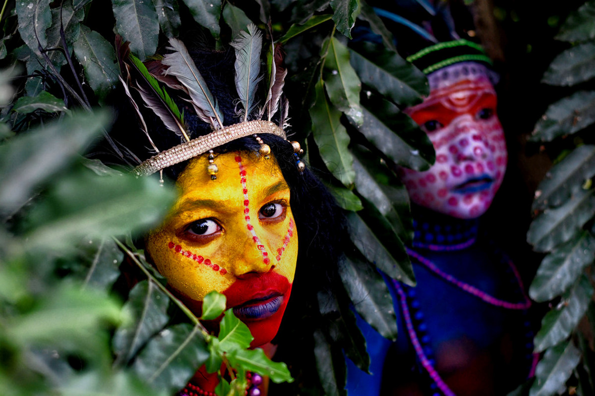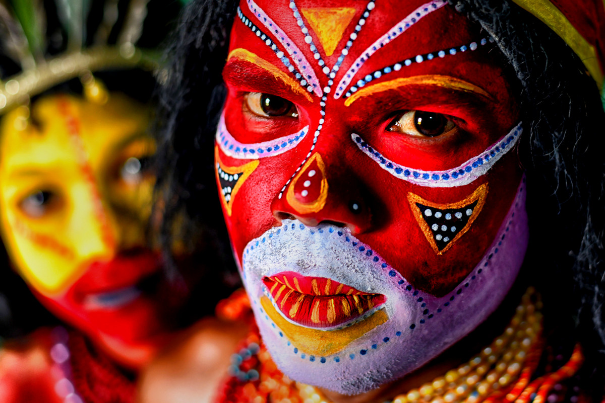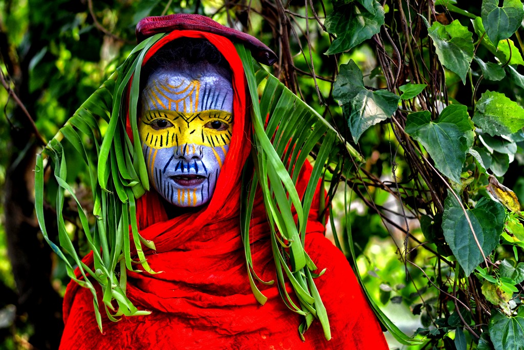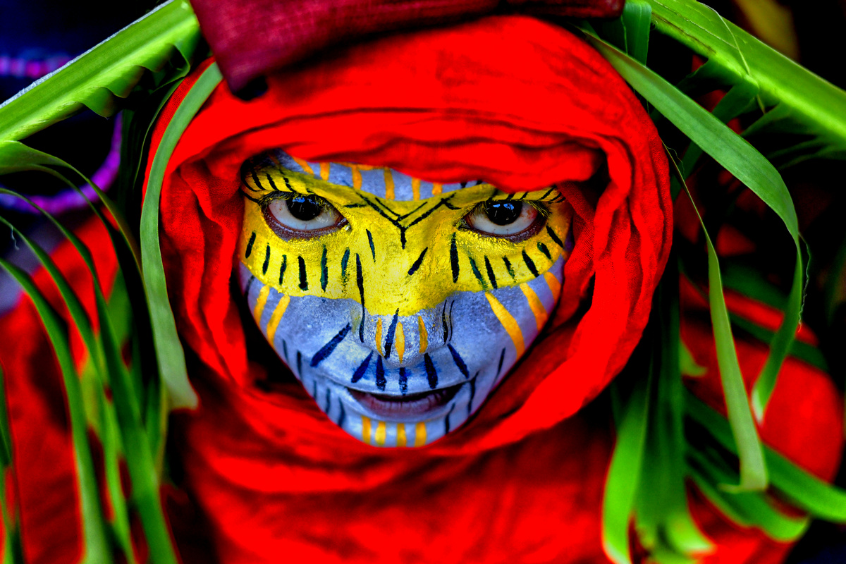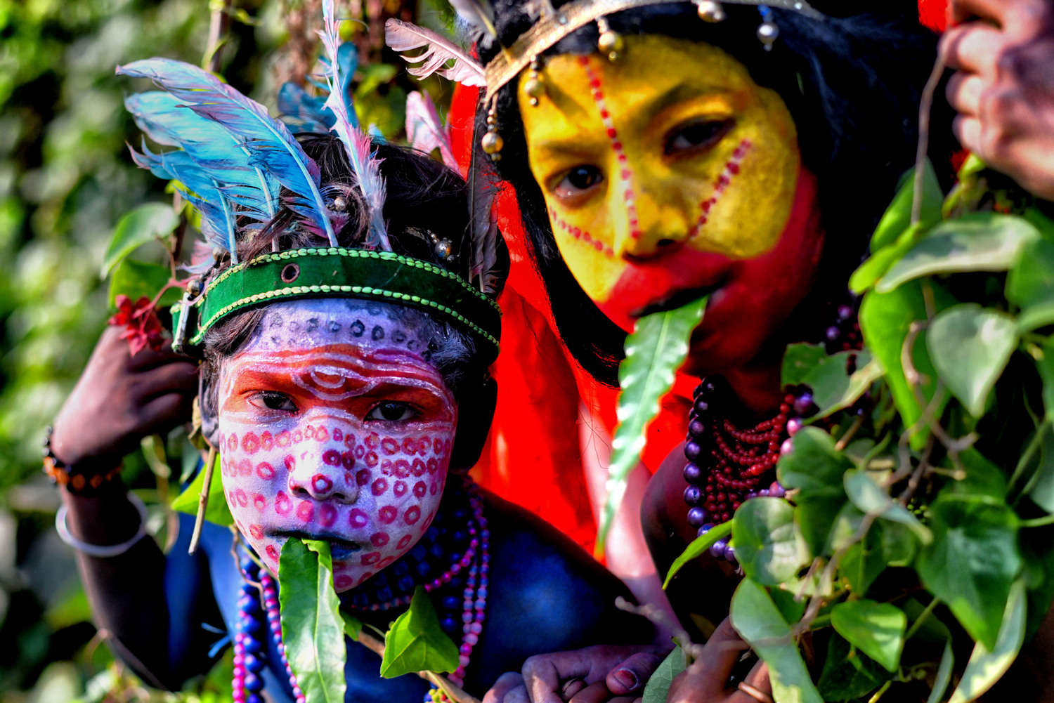 Young children & their family members pose with their faces painted as part of their Impersonating Act on the theme of different Tribal Cultures. For generations Bahurupi artists from West Bengal have been practicing in the art of face painting. Using their painting techniques they can easily metamorphose into different characters during a performance, which often represents tribal myths. These traditional artists scrape a living from their performances, relying on the generosity of audiences for their income