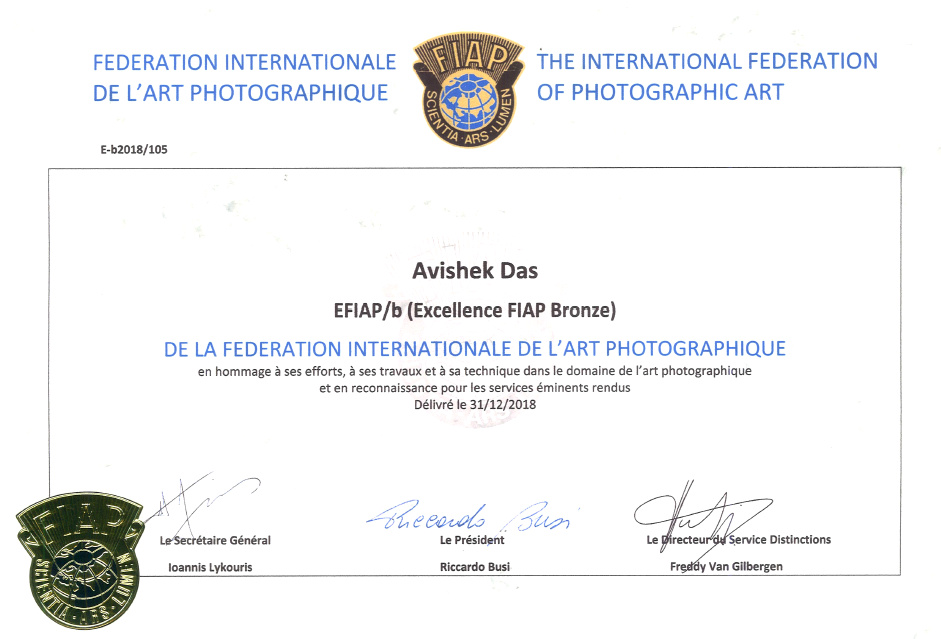 He has been appointed as Jury Member from Russia, Bosnia, Serbia, India for different International Photography Competitions for more than 25 times. For his Photographic Development & Achievement recently he has been Awarded with Distinction EFIAP Bronze (Excellence FIAP) from Fédération Internationale de l'Art Photographique (France) Recognized by UNSECO and Crown Level 2 by Global Photographic Union , Greece , SSS/r by Sille Art Gallery , Turkey , EFIP from Federation of Indian Photography , Hon. PESGSPC / GPA PESGSPC from Cyprus , Hon. CAMPINA from Romania .