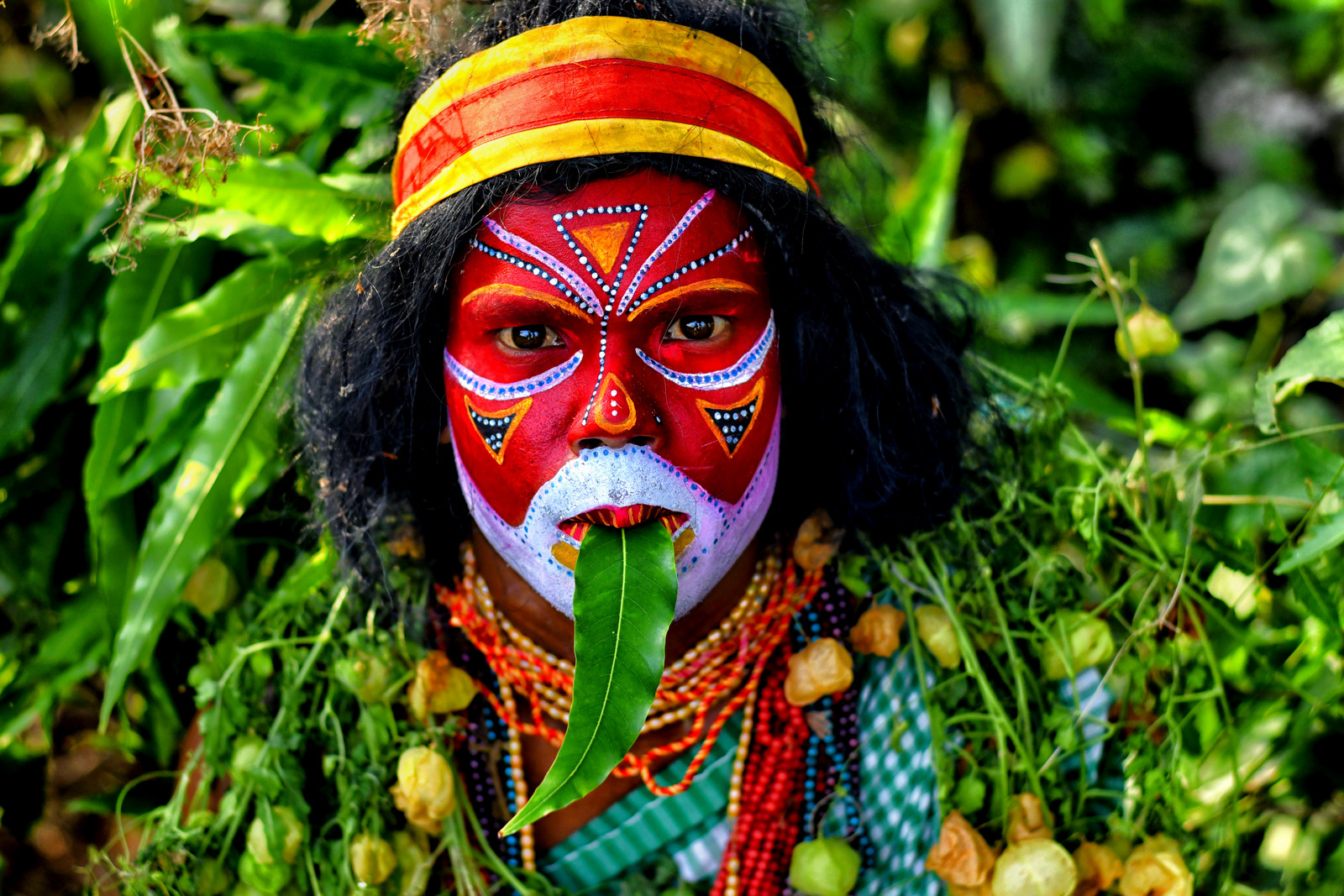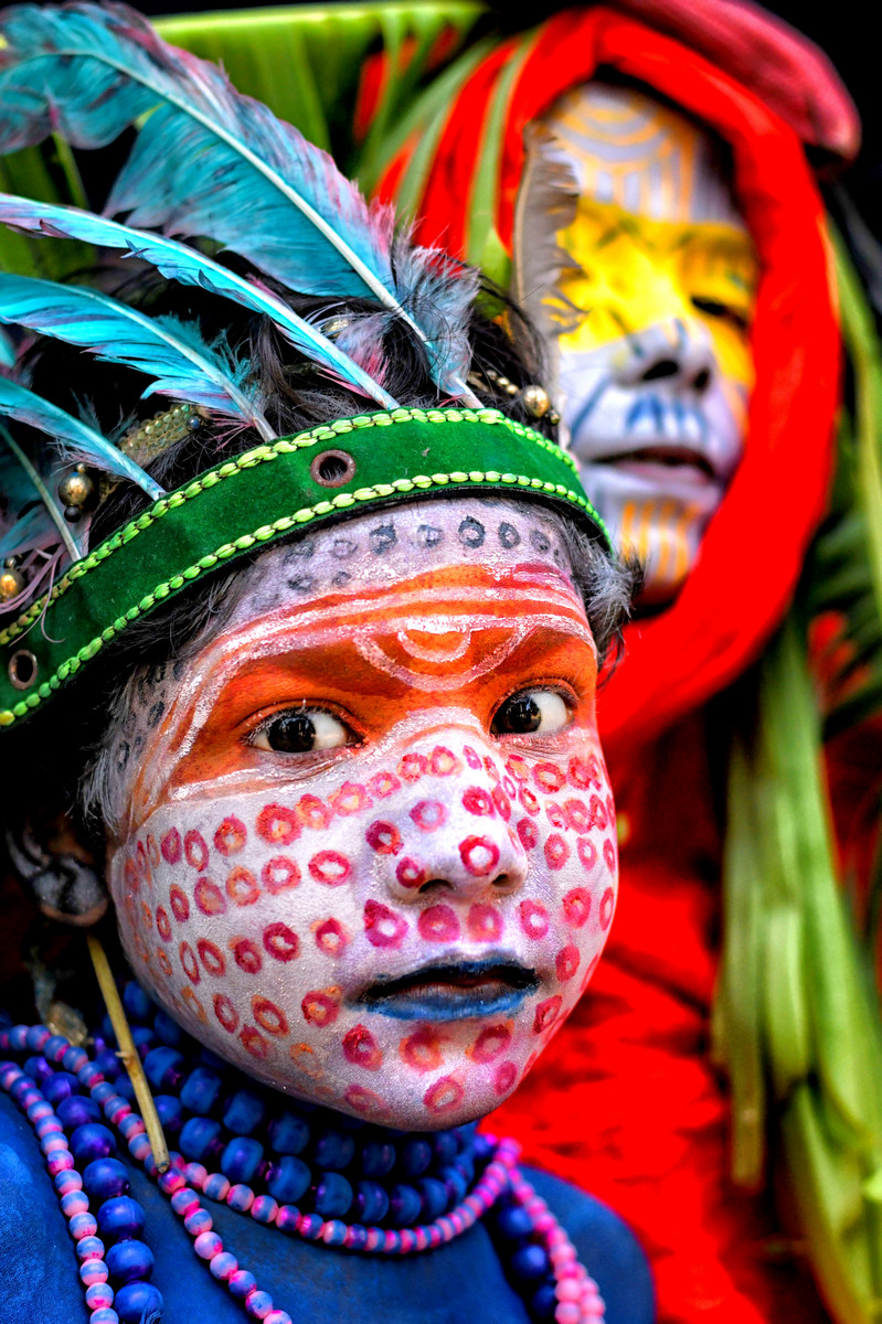 Young children & their family members pose with their faces painted as part of their Impersonating Act on the theme of different Tribal Cultures. For generations Bahurupi artists from West Bengal have been practicing in the art of face painting. Using their painting techniques they can easily metamorphose into different characters during a performance, which often represents tribal myths. These traditional artists scrape a living from their performances, relying on the generosity of audiences for their income
