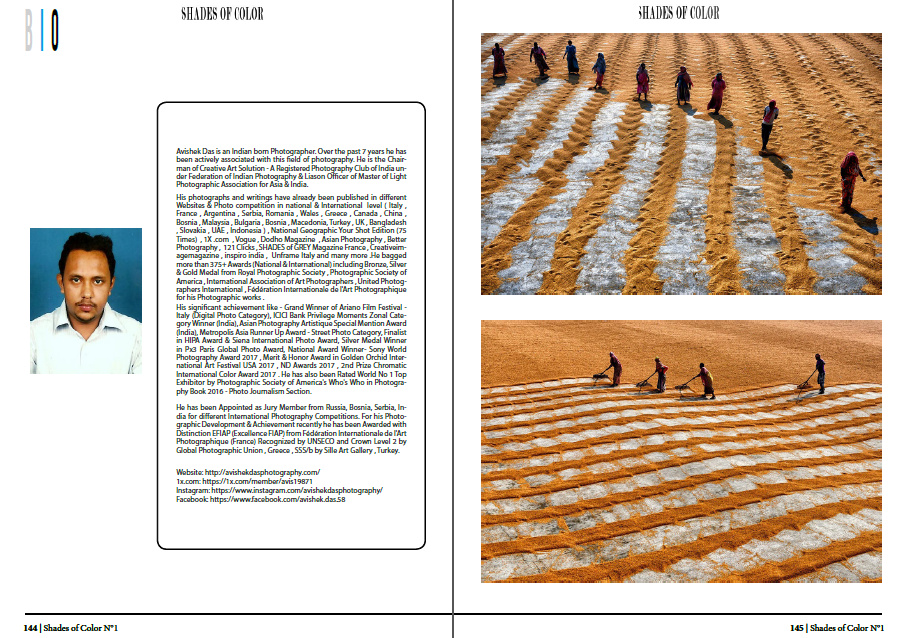 His photographs and writings have already been published in different Websites & Photo competition in national & International level ( Italy , France , Argentina , Serbia, Romania , Wales , Greece , Canada , China , Bosnia , Malaysia , Bulgaria , Bosnia , Macedonia, Turkey , UK , Bangladesh , Slovakia , UAE , Indonesia ) , National Geographic Your Shot Edition (80 Times) , 1X .com , Vogue , Dodho Magazine , Asian Photography , Better Photography , 121 Clicks , SHADES of GREY & Color Magazine France , Creativeimagemagazine , inspiro India , Unframe Italy , Singapore Airlines Silk Magazine and many more His photographs from Reportage & Journalism events are regularly featured on Yahoo Global , The Times UK Edition , The Telegraph UK edition , The Guardian Newspaper , Forbes Magazine , BBC UK , CNBC News , ABP Ananda , Daily STAR UK , Asianet News , Aljazeera News , CGTN News, Msn News , Huffington Post ,ESPN News , DPA International , Mail online UK Edition & many more .He bagged more than 480+ Awards (National & International) including Bronze, Silver & Gold Medal from Royal Photographic Society , Photographic Society of America , International Association of Art Photographers , United Photographers International , Fédération Internationale de l'Art Photographique for his Photographic works .