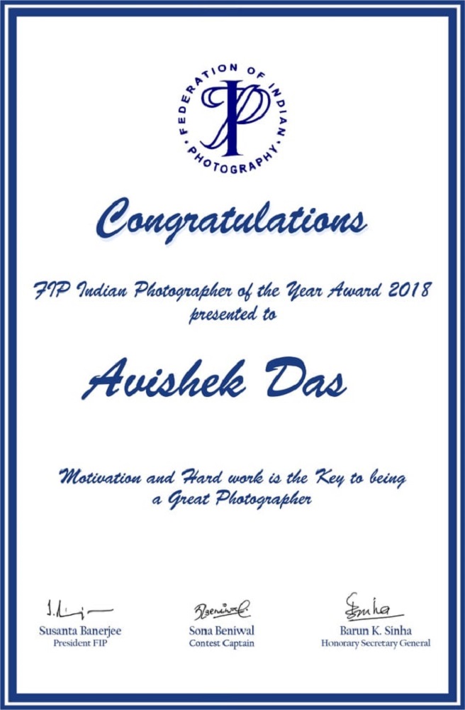 His significant achievement like - Grand Winner of Ariano Film Festival - Italy (Digital Photo Category), ICICI Bank Privilege Moments Zonal Category Winner (India), Asian Photography Artistique Special Mention Award (India), Metropolis Asia Runner Up Award - Street Photo Category, Finalist in HIPA Award & Siena International Photo Award, Silver Medal Winner in Px3 Paris Global Photo Award, National Award Winner- Sony World Photography Award 2017 , Merit & Honor Award in Golden Orchid International Art Festival USA 2017 , ND Awards 2017 , Tokyo International Photo Awards 2017 , 2nd Prize Chromatic International Color Award 2017 , Life Press Photo Award Ukraine 2018 (2nd Prize) , 1st Prize as Category Winner of Pink Lady Food Photographer of the Year 2019 , United Kingdom in World Food Category . He has also been Rated World No 1 Top Exhibitor by Photographic Society of America's Who's Who in Photography Book 2016 - Photo Journalism Section. Avishek secured the 3rd Place in People Category of National Geographic Global Photo Contest - 2018.